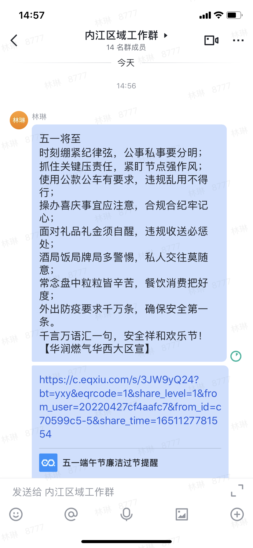 嚴(yán)明紀(jì)律早提醒。29日下午,內(nèi)江區(qū)域公司召開(kāi)2022年五一端午期間廉潔過(guò)節(jié)集體談話提醒會(huì)。會(huì)上傳達(dá)學(xué)習(xí)了近期《中央紀(jì)委國(guó)家監(jiān)委公開(kāi)通報(bào)十起違反中央八項(xiàng)規(guī)定精神典型問(wèn)題》及華潤(rùn)燃?xì)狻蛾P(guān)于2022年五一端午期間貫徹落實(shí)中央八項(xiàng)規(guī)定精神廉潔過(guò)節(jié)的通知》精神,要求全體黨員干部以案為鏡,認(rèn)真反思總結(jié),汲取深刻教訓(xùn),嚴(yán)格自律;在節(jié)日期間更要注意管好自己的“朋友圈”“社交圈”,嚴(yán)格家教家風(fēng),文明過(guò)節(jié)。