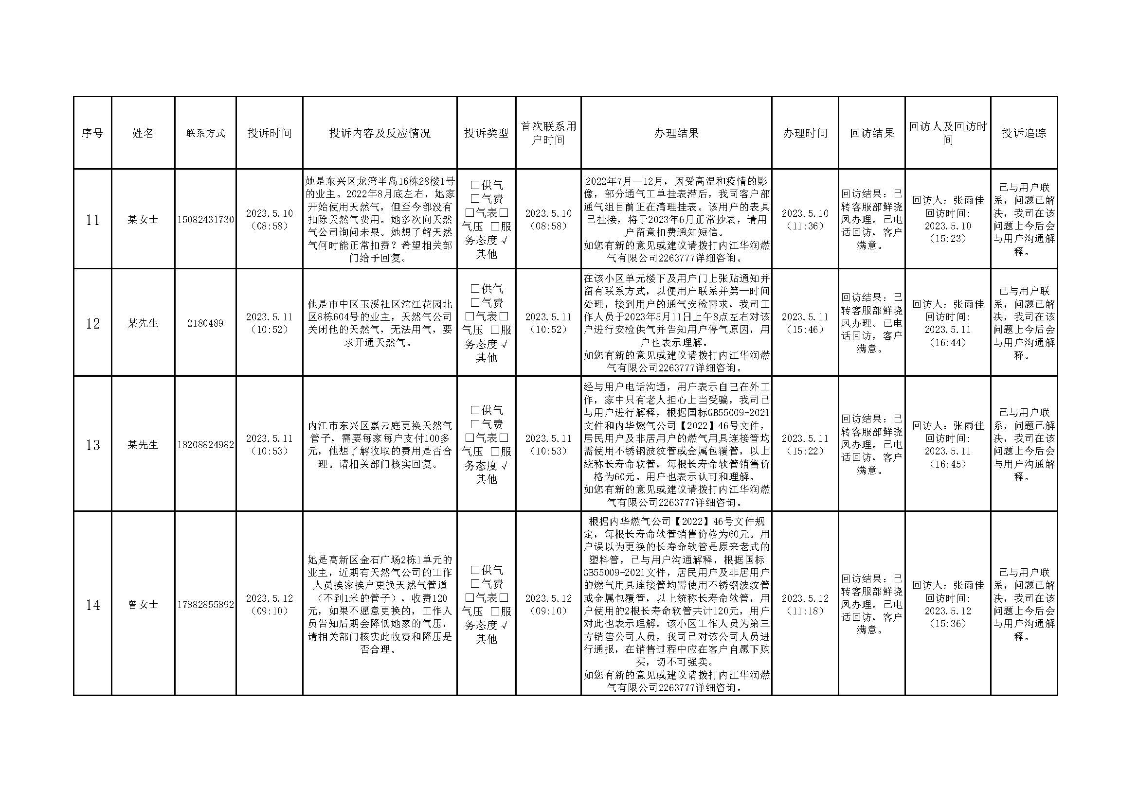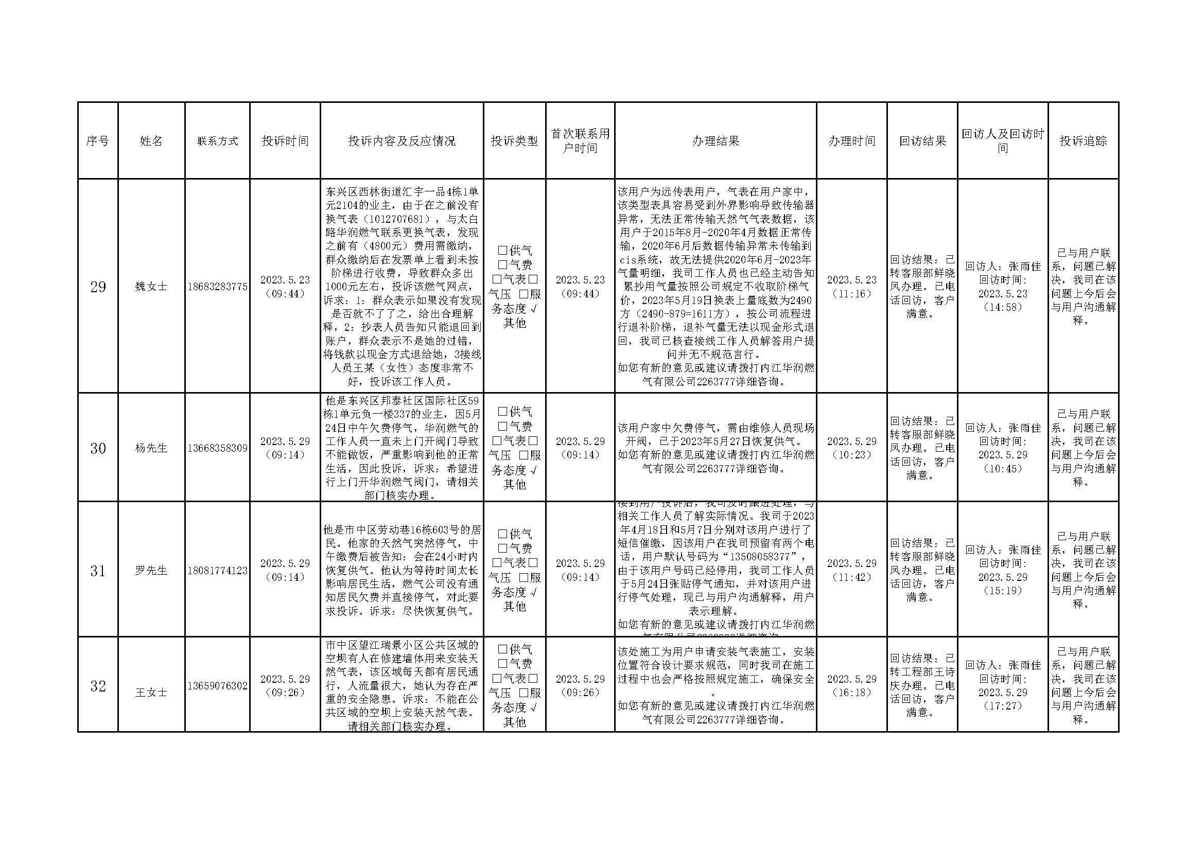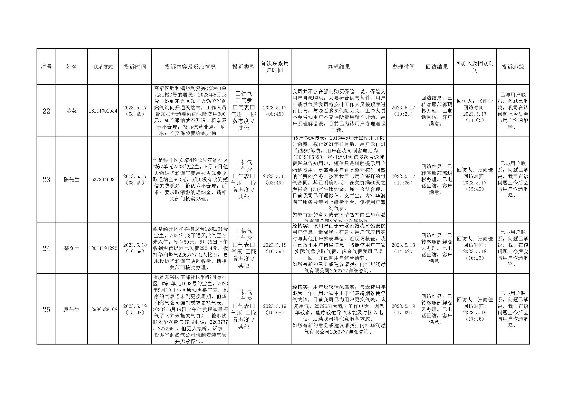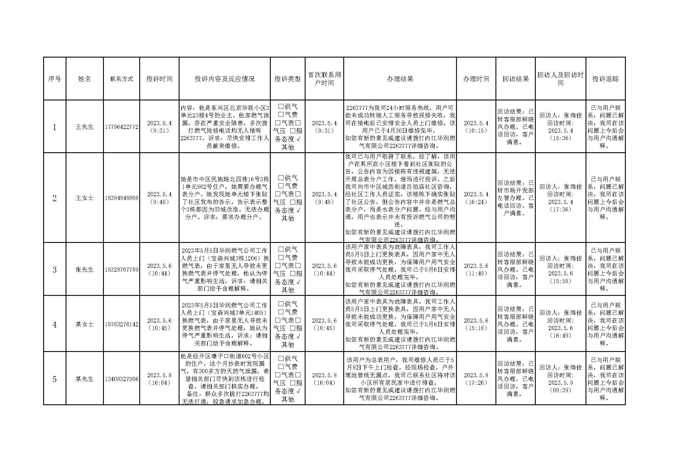 2023年5月投訴辦理及回訪情況