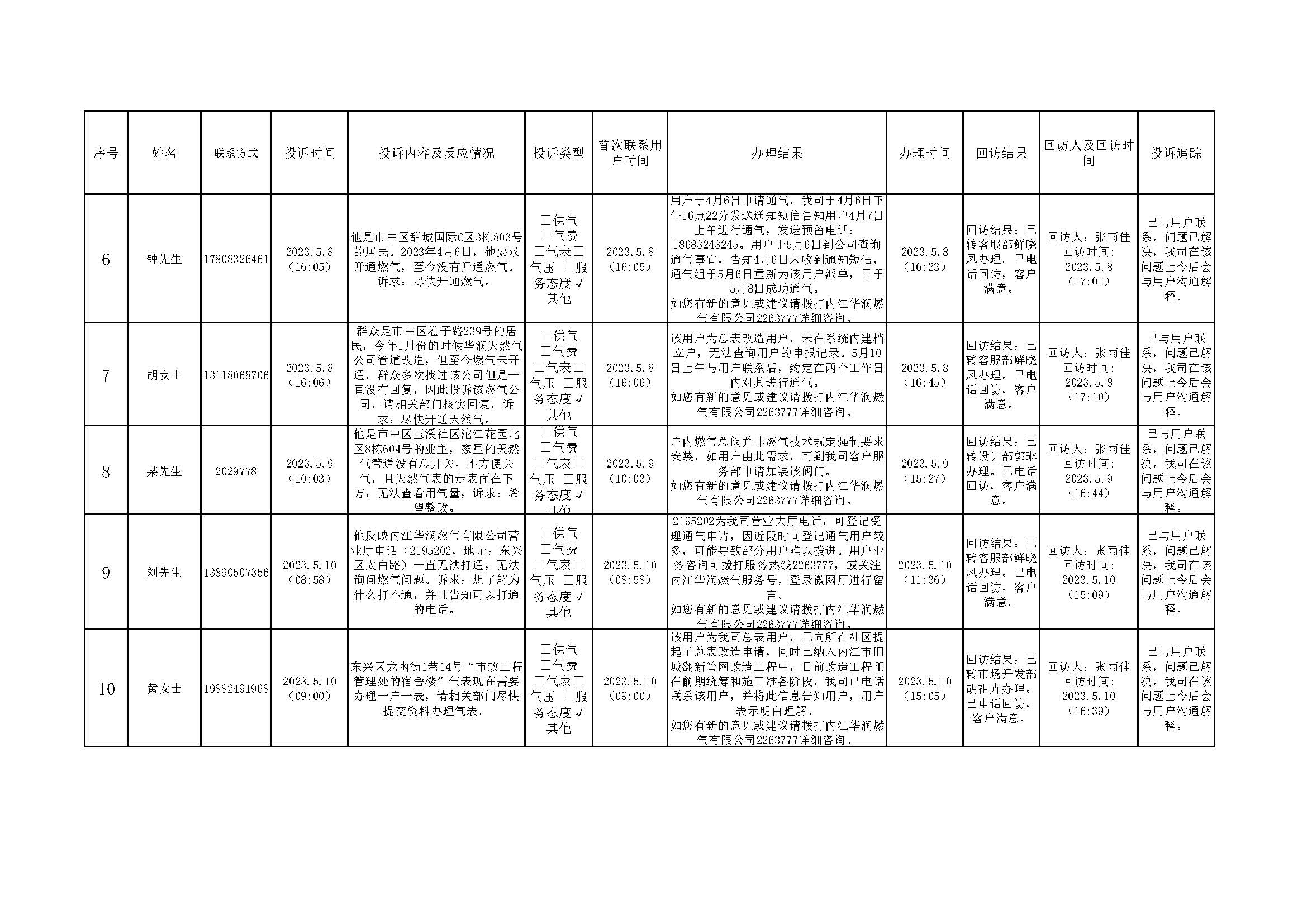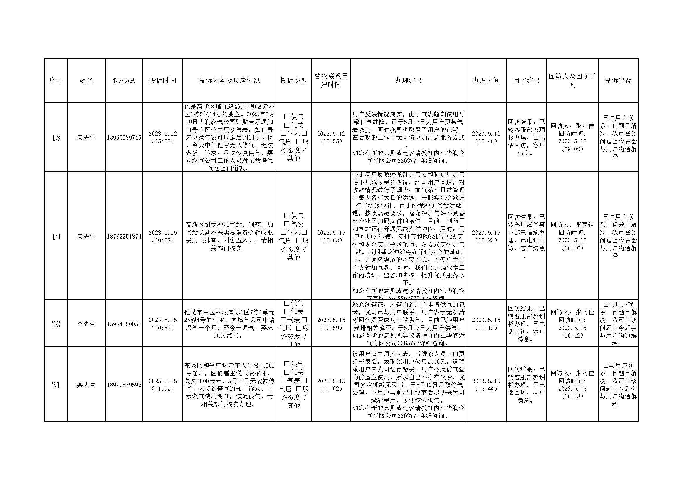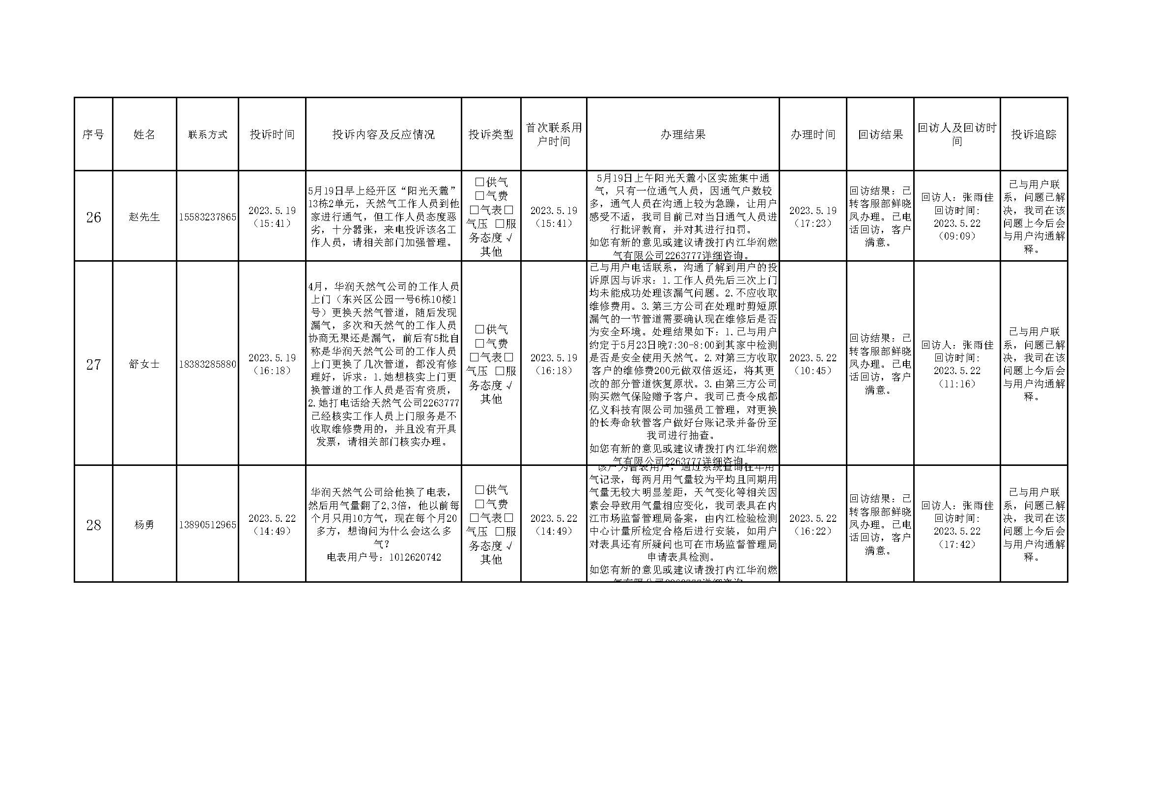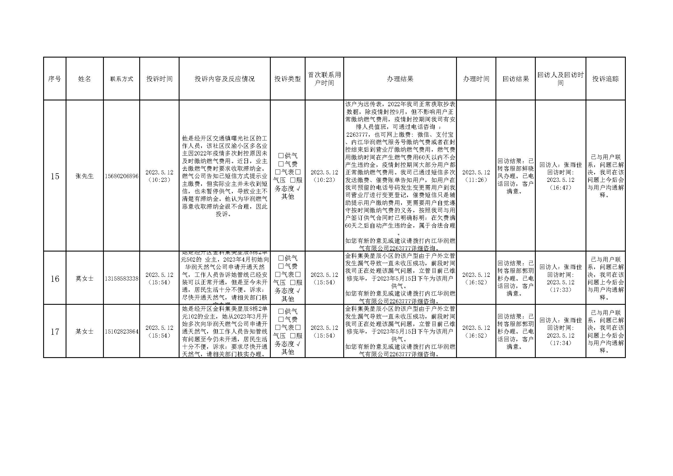 2023年5月投訴辦理及回訪情況
