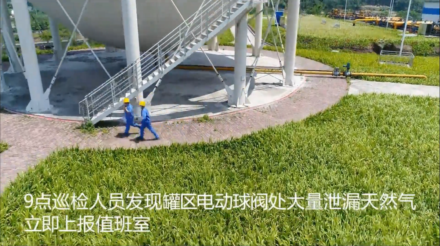 演練現(xiàn)場,巡查人員在日常巡查中發(fā)現(xiàn)儲氣罐燃氣泄漏,按照應急處置流程上報至城西儲配站站長羅亞川,演練正式開始。14時30分,站長羅亞川到達事故現(xiàn)場,組織站內(nèi)工作人員拉出安全隔離區(qū)并穿防火服和佩戴正壓式空氣呼吸器進入事發(fā)點。在進行停氣處置后確認已無燃氣泄漏的情況下,維修組進入事發(fā)點進行維修。維修完成后上報調(diào)度中心恢復供氣。