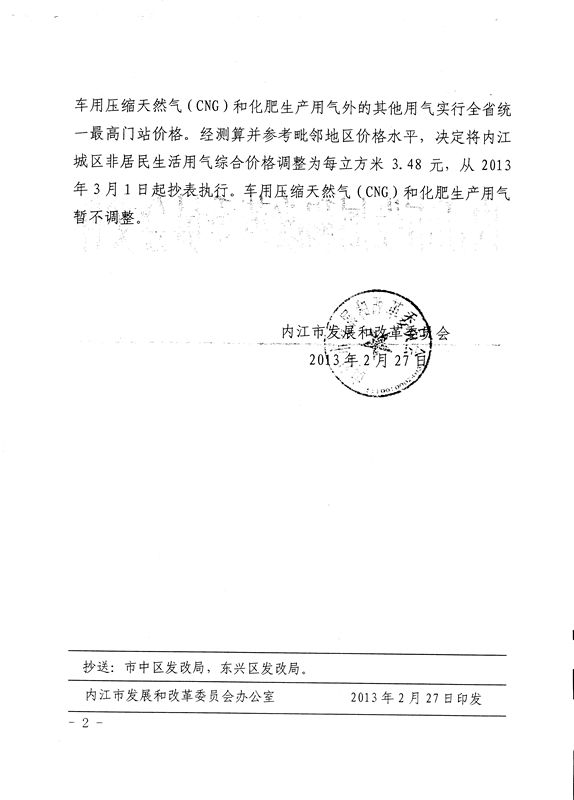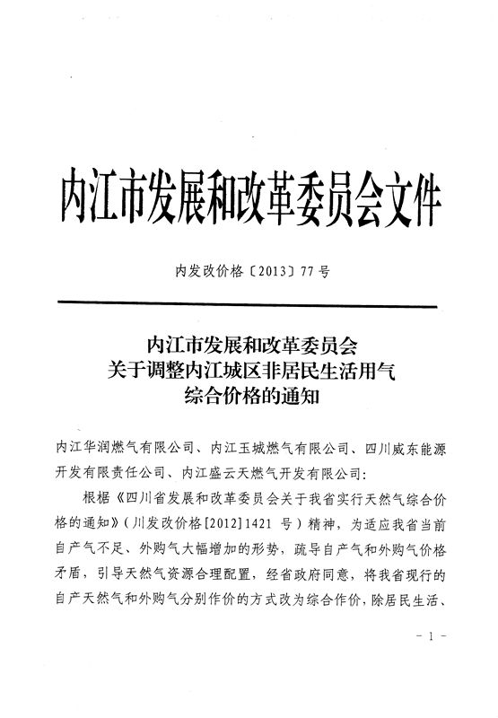 關(guān)于調(diào)整內(nèi)江城區(qū)非居民生活用氣綜合價格的通知